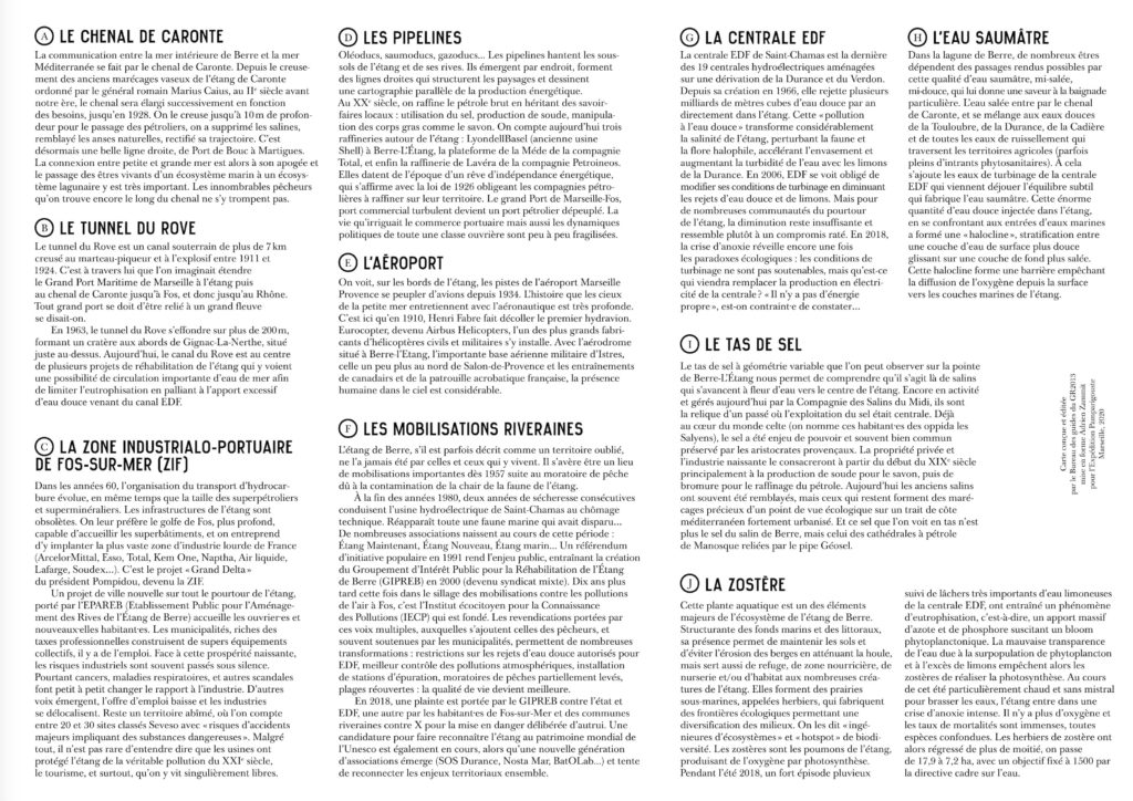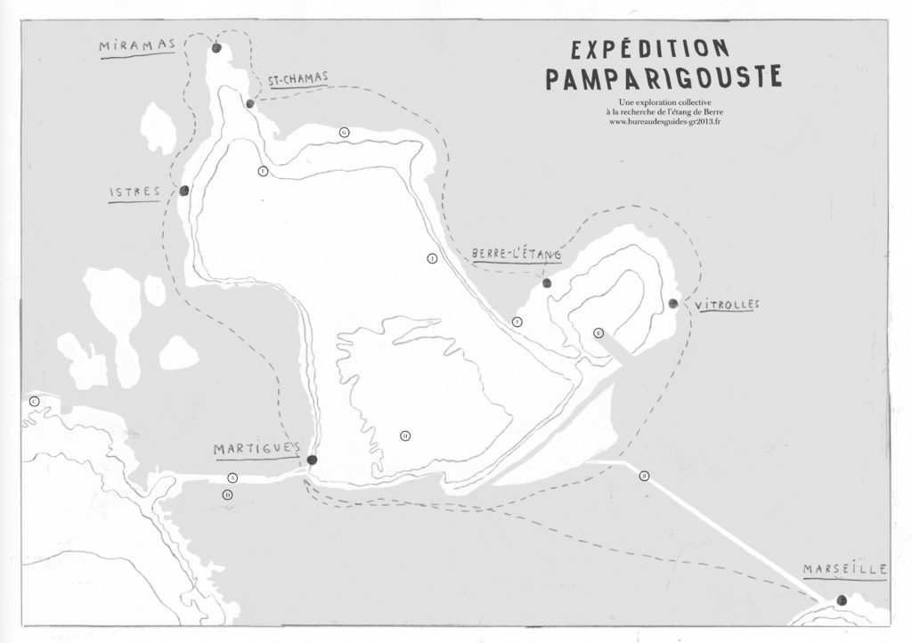 Une journée de marche ponctuée :Des interventions de Sarah Vanuxem (chercheuse en droit de l’environnement), Laurence Nicolas (ethnologue et anthropologue), du photographe Geoffroy Mathieu, de la plasticienne Camille Goujon et des artistes du Collectif SAFI.Avec la participation des habitants de Berre-l’Étang (Luc, Isabelle, Jean-François, Jean-Claude, Aline, David…), l’association SOS Durance et de l’ensemble de l’équipage de Pamparigouste.