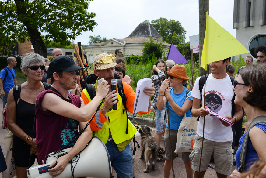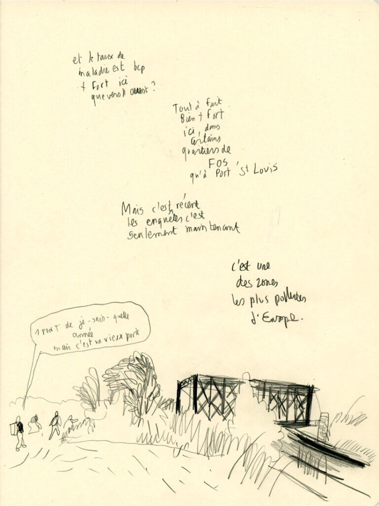 Nous partîmes de Port-de-Bouc, longeâmes la côte industrielle traversée de pipelines, longeâmes aussi des lacs roses et violets, traversâmes des forêts de pins et de pierre blanche (du saffre je crois), dormîmes le soir au bord de l’étang de Berre, accueillis (et bien) par Yes we Camp. Nous cueuillîmes des plantes comestibles grâce aux conseils des Safi. Je regrette surtout d’avoir oublié le mec bodybuildé en slip de bain au bord de l’étang, qui paradait au son des basses de son autoradio, un superbe spécimen d’une espèce peut être menacée, si l’on n’y prend garde.