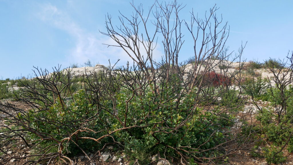Repousses de pistachiers lentisques depuis les lignotubers © Mathilde Rouziès