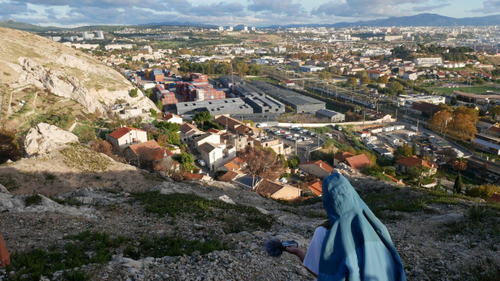 Nous marchons sur la colline jusqu’à avoir une grande vue panoramique sur le port de l’Estaque. Nous apercevons la barre d’immeuble appelée le Château Bovis, incendiée le 8 juillet. Sur Marsactu : Après l’incendie, les sinistrés de Château-Bovis construisent de nouveaux mobil-homes – le 14 Août 2025