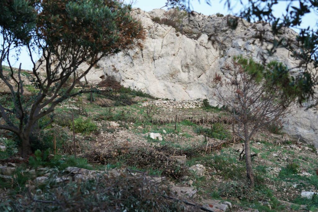 – La restanque qui s’était effondrée il y a quelques années. Avec l’aide de 4 amis, en 4 jours (seulement), et sans connaissances professionnelles particulières, ils ont monté deux murs en pierres sèches.