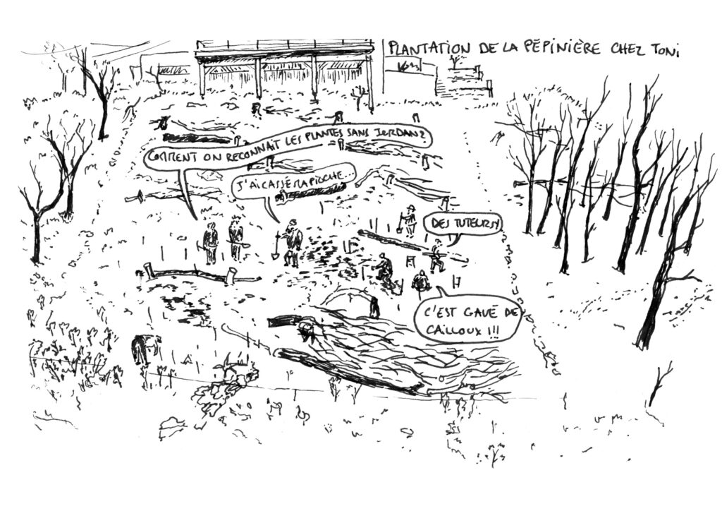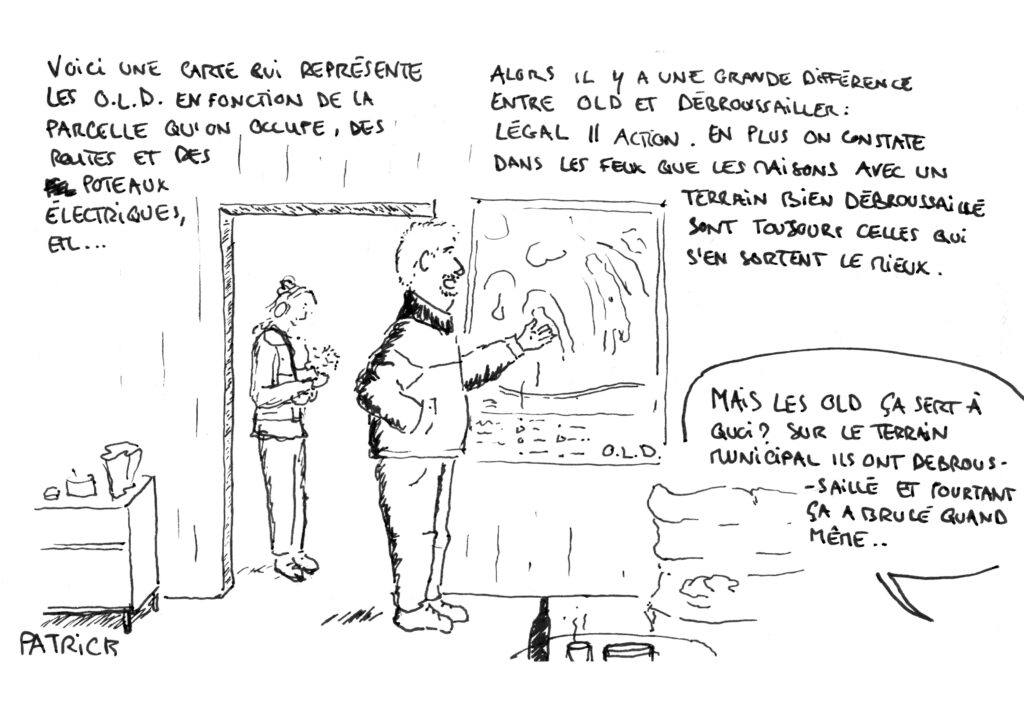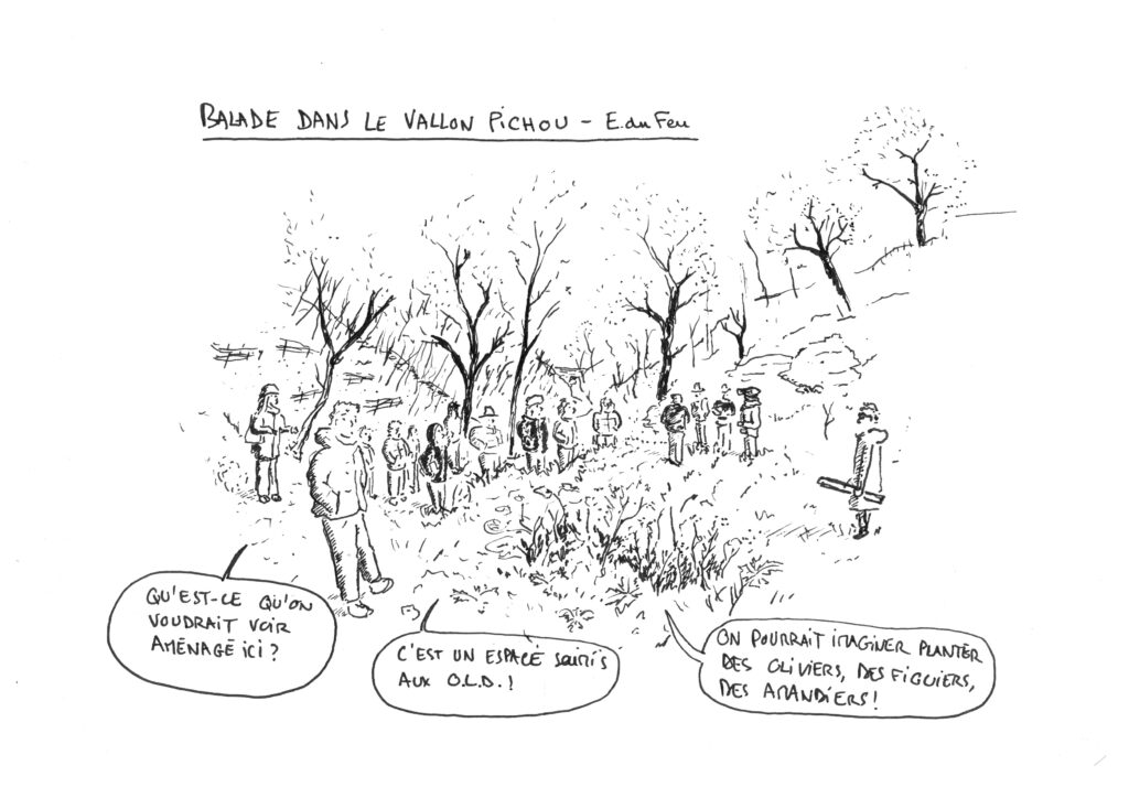 Depuis 3 mois, l’École du feu propose des balades pour mieux comprendre le feu, mieux vivre avec le risque, mieux se protéger de l’incendie. On y a parlé de nos maisons et de l’urbanisation ; Des reliefs de nos collines, du sol, et de la végétation ; Des réglementations et de la gestion des risques ; Des usages, anciens ou à ré-inventer, d’ici ou d’ailleurs, qui permettent de se protéger. Nous démarrons l’année en allant sur le terrain faire ensemble des travaux pratiques ! Le matin sera dédié à l’esquisse de projet, et l’après-midi à un atelier de jardinage. Voici quelques dessins réalisés par Timothée durant cette journée.
